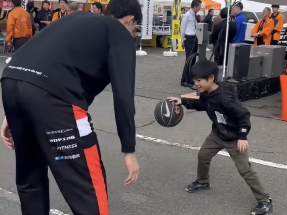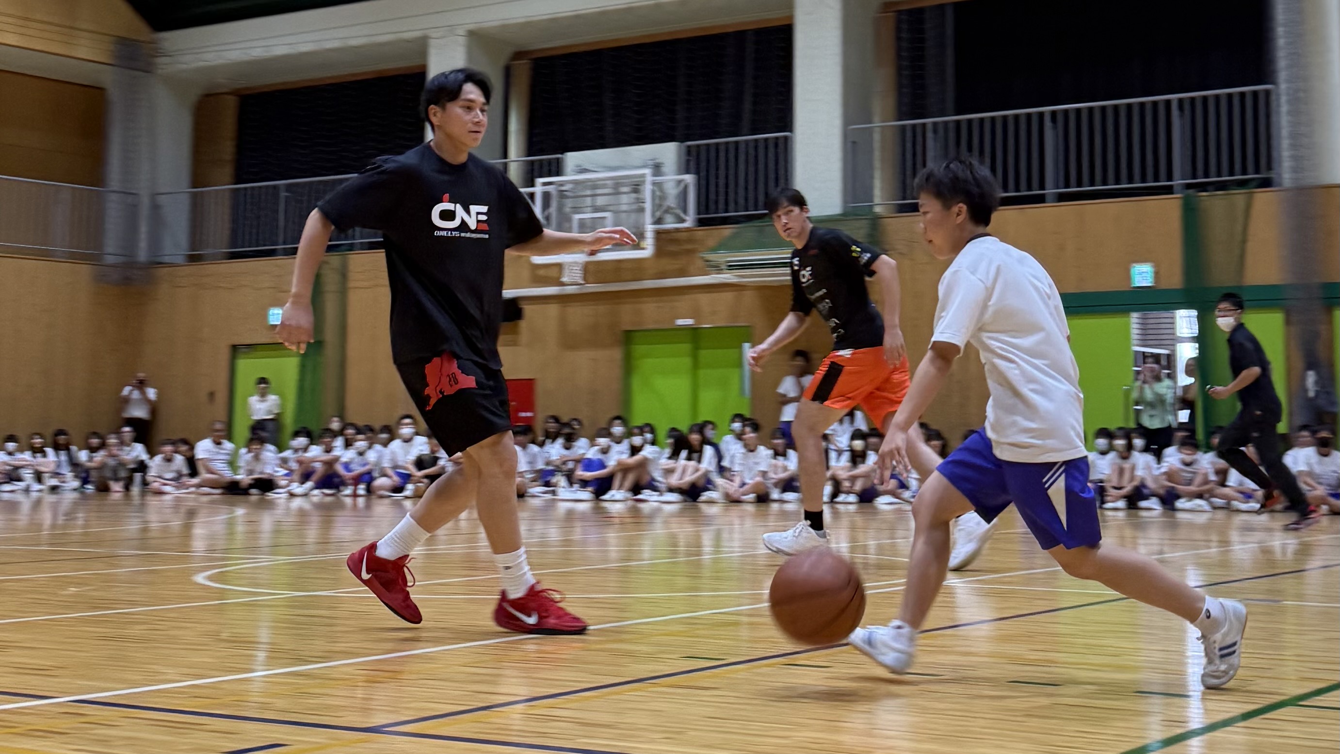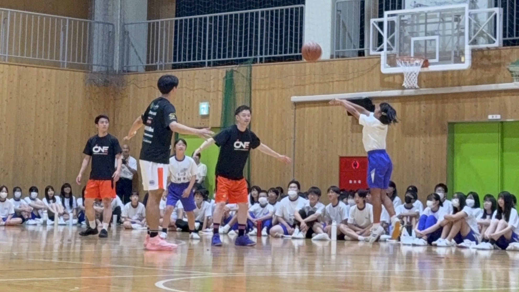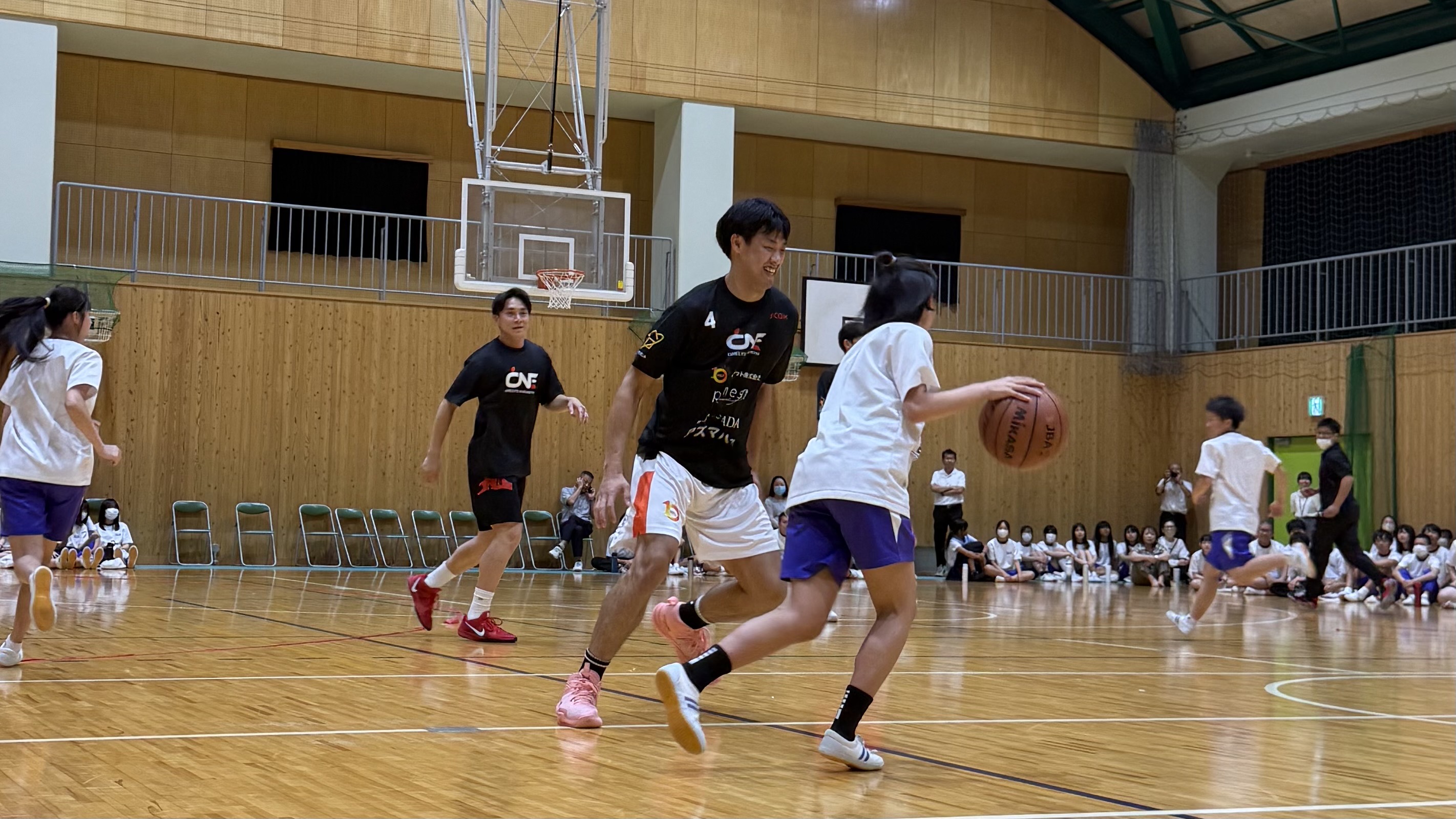 講演後に選手とのバスケ対決!