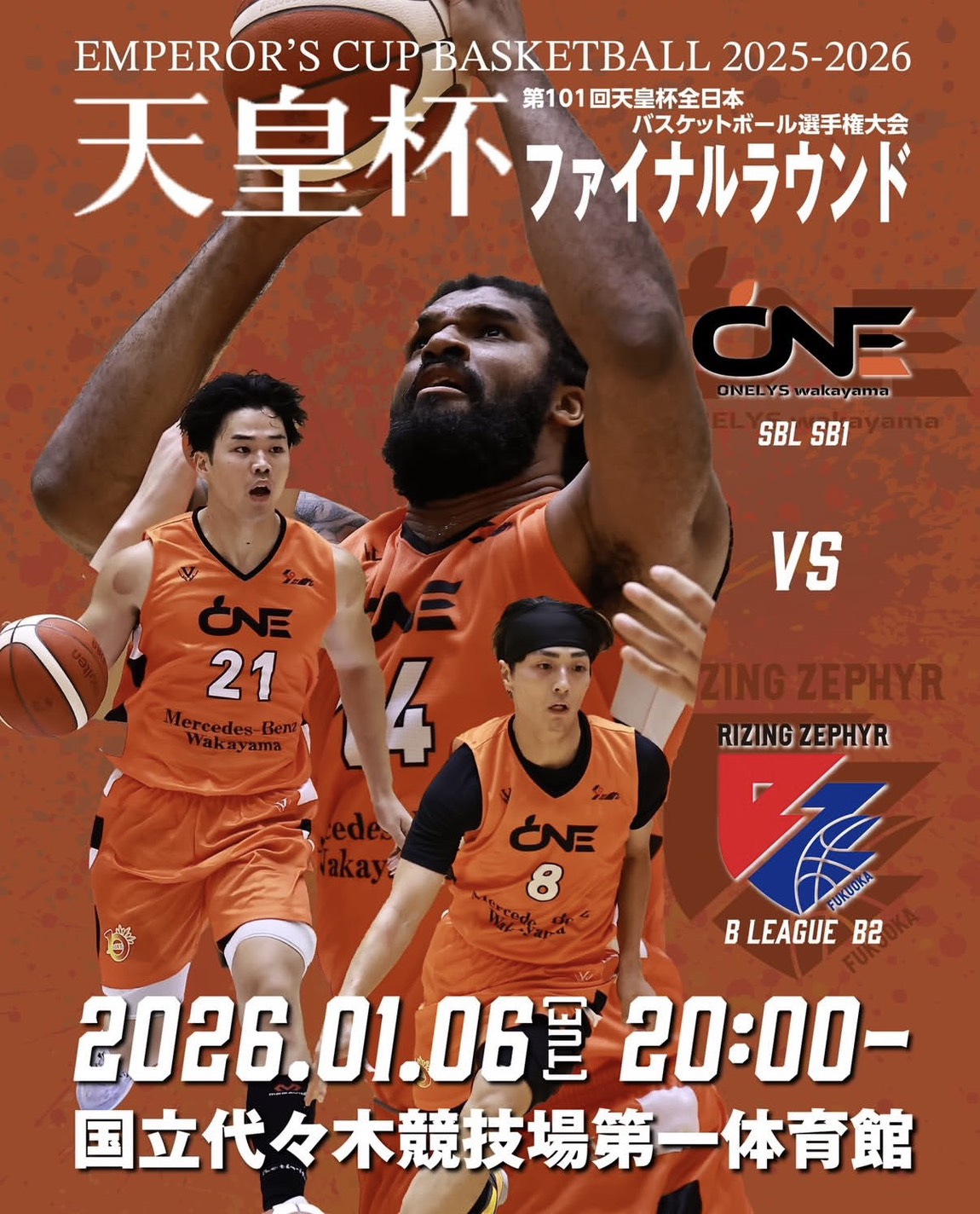 第101回天皇杯全日本バスケットボール選手権大会 ついにファイナルラウンドへ!! 2026年1月6日(火)東京都・国立代々木競技場第一体育館 TIPOFF 20:00 vs ライジングゼフ...